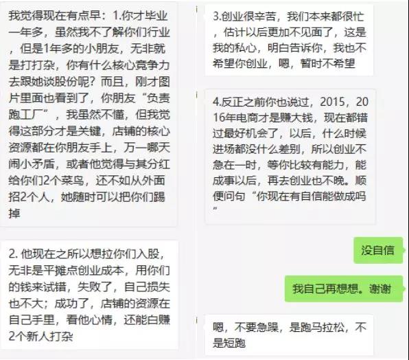 从旁观者角度来说,男友非常理性,虽说不是本行人士,但是已经把合伙创业的风险罗列的清清楚楚,也得到了绝大多数网友的支持!