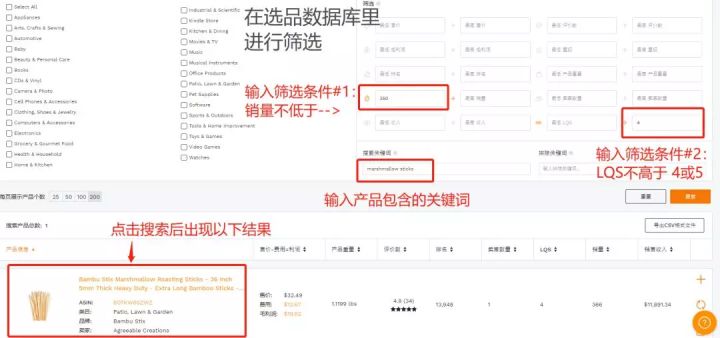 首先,找到Listing做得较差,但销量还可以的竞品ASIN。一个快速的方法是,通过网页版里的选品数据库,输入产品包含的关键词,设置以下两个筛选条件: