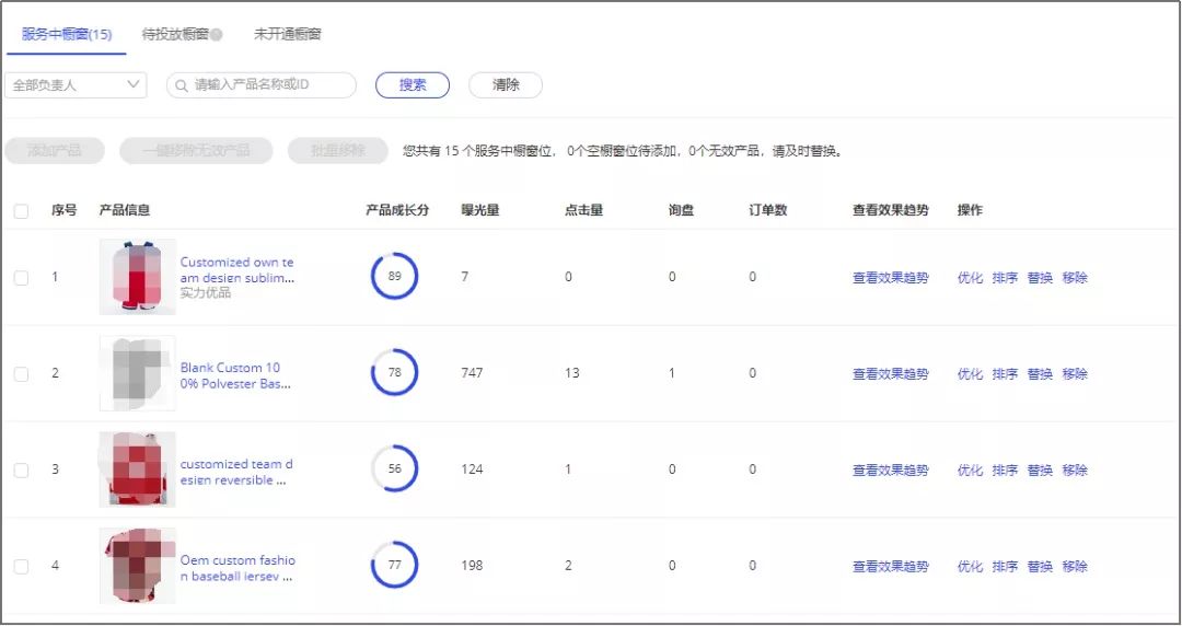 可以直接看到产品的成长分及曝光点击询盘和订单数,还可以直接在右边进行优化、排序、替换和移除操作。