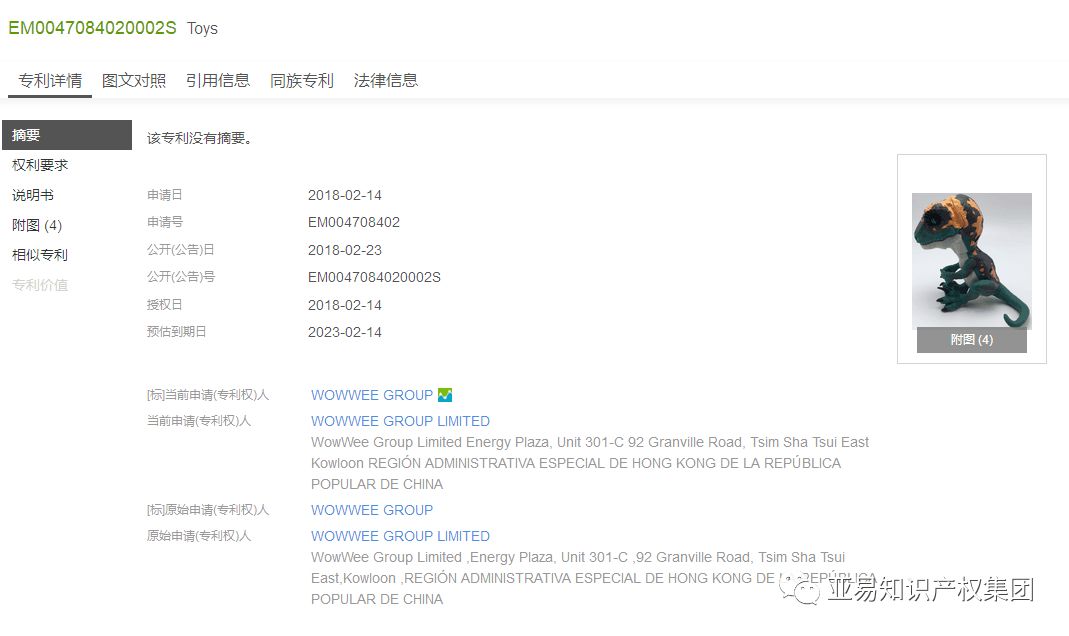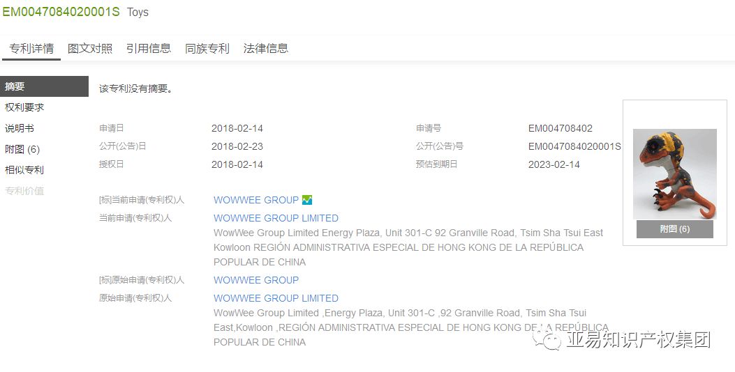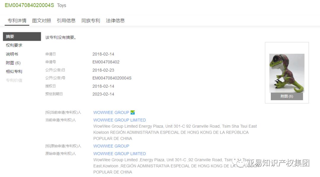 针对以上产品,我们一共检索到了三款欧盟外观专利,有做指尖恐龙的卖家请注意,需要从外观上跟专利产品有所区别,不要造成普通消费者的混淆。