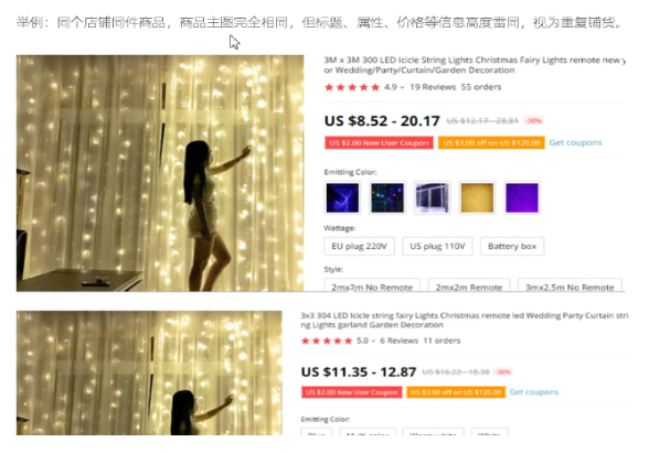 重复铺货。发布的产品信息与在同个店铺内或在同个卖家或平台基于多重特征认定的同个主题开立的其它店铺内已发布的产品信息完全相同或主要产品信息雷同。重复铺货将可能导致降权,删除商品,下架商品的处罚。重复铺货现象,主要有:主图一致重复铺货,不同角度、背景、颜色等的重复铺货,同一店铺或者不同店铺间的重复铺货。