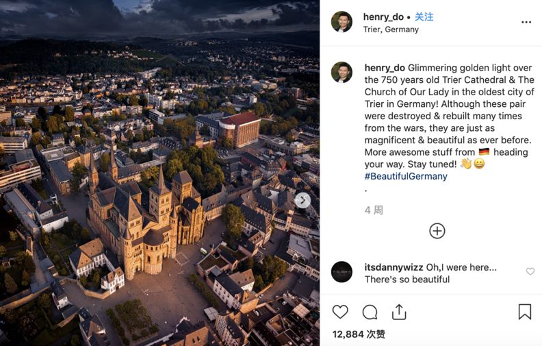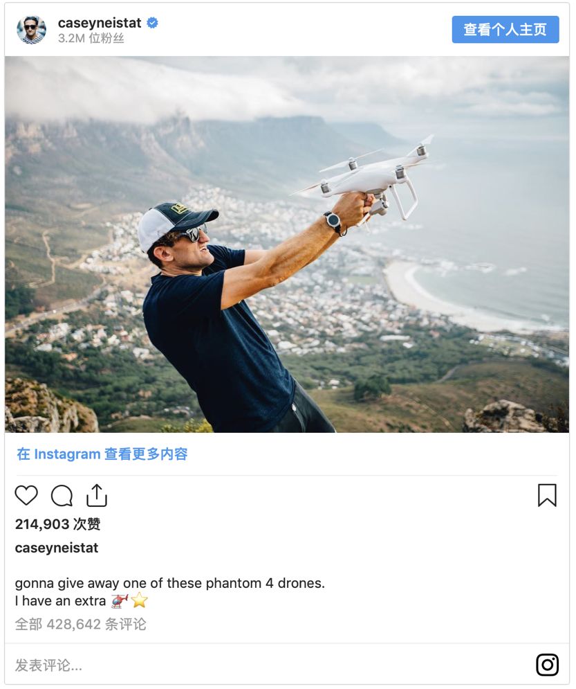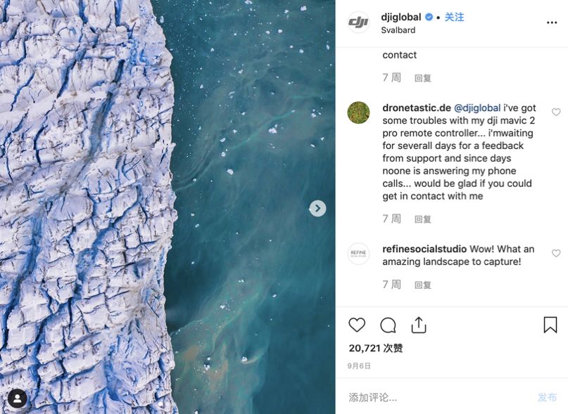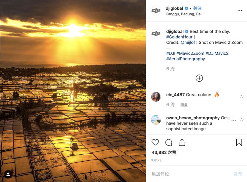 其实每位消费者都可以通过无人机拍摄出美丽的照片和视频。这对于大疆来讲,绝对是免费且高效的宣传方式。在社媒Instagram上,大疆开创了名为djicreator(大疆创意师)的标签,鼓励来自全球的无人机粉丝上传自己通过机器拍摄的美丽佳片。如果照片质量高的话,大疆还会通过自己的官方账号进行投放和宣传。