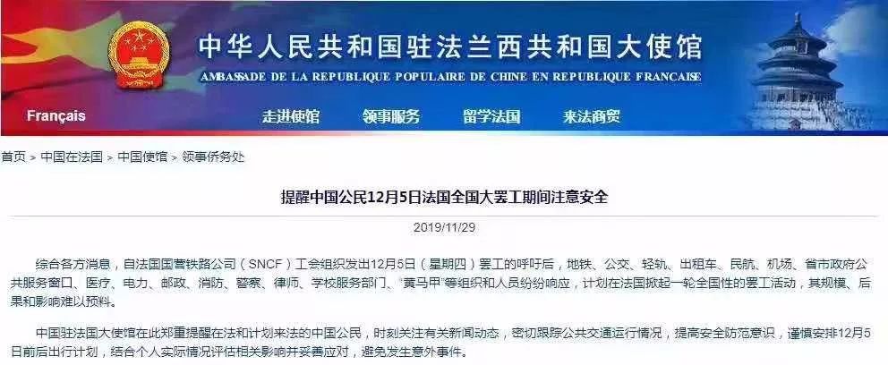 据中华人民共和国驻法兰西共和国大使馆消息,从12月5日开始,法国将开始历史上最大规模、涉及超过15个行业及组织的无限期大罢工。