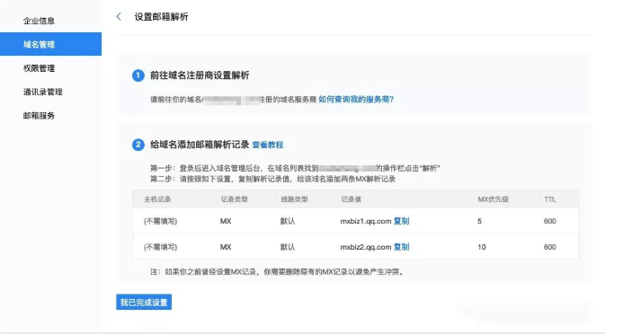 注册或者购买一个品牌域名后缀结尾的企业邮箱,需要对邮箱进行域名解析,成功后才能正常收发邮件。