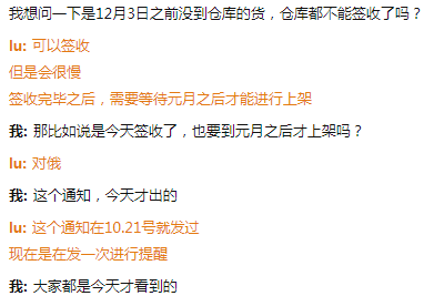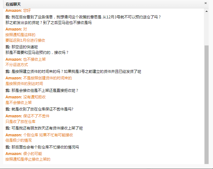 客服表示亚马逊库房容量紧张,在12月3日未收到的货件将不能进行销售!要卖家延迟至1月进行补货!