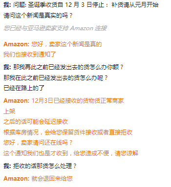 又有客服表示在途货物在元月才开始接收!货物到达亚马逊仓库会被拒收,然后退还给卖家......