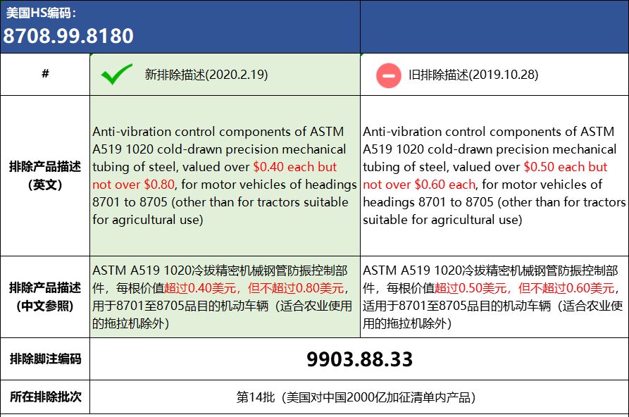 本次公告还对此前第14批排除产品中编码为8708.99.8180和第15批排除产品中编码为4201.00.3000和第16批排除产品中编码为9405.20.6010的排除描述进行了更新: