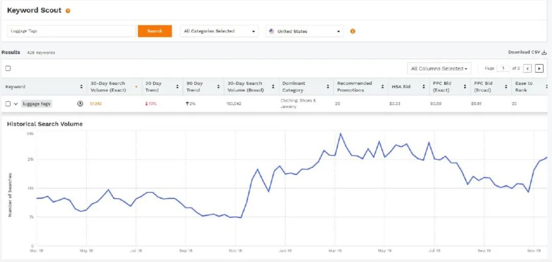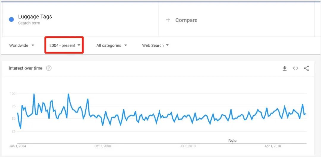 这里我们可以借助两个工具来进行检测,一是Google Trends, 另一个是Jungle Scout 的关键词跟踪器。以Luggage Tags这个关键词为例: