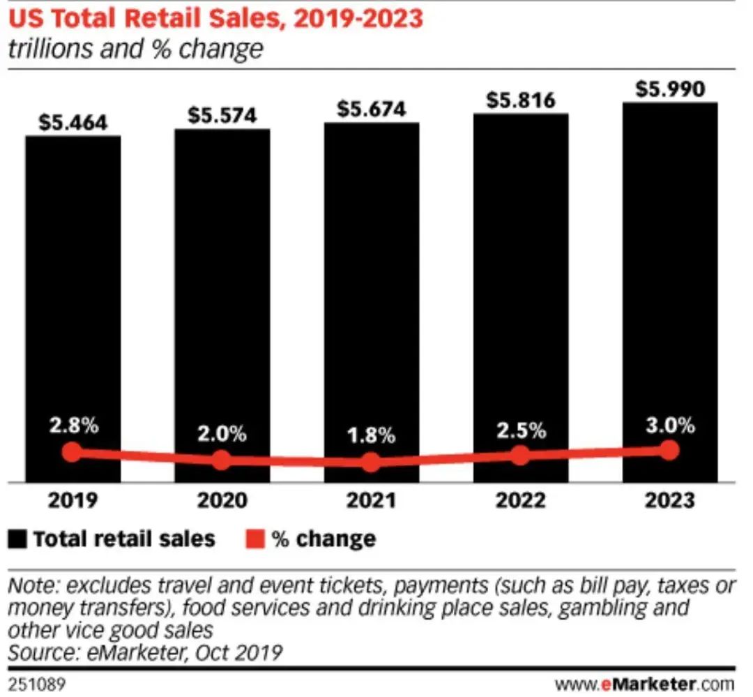 且eMarketer估计,到2020年,美国零售总额将增长2.0%,达到5.574万亿美元。