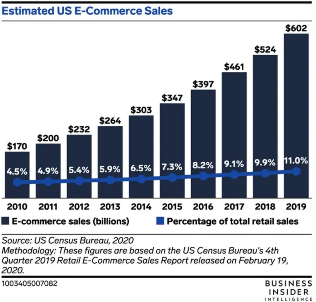 此外,美国电商零售额在2019年约占零售总额的11%,高于其在2018年的9.9%;2019年美国电商销售额增长了14.9%,高于2018年同期13.6%的增长。
