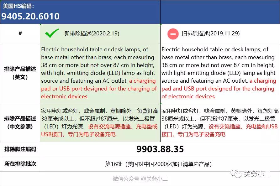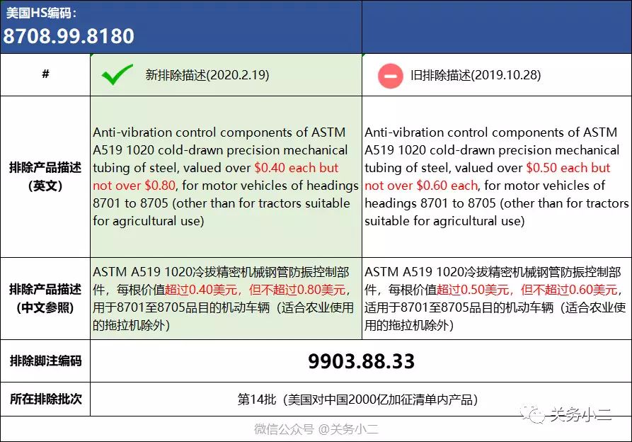 本次公告对此前第14批排除产品中编码为8708.99.8180和第15批排除产品中编码为4201.00.3000和第16批排除产品中编码为9405.20.6010的排除描述进行了更新: