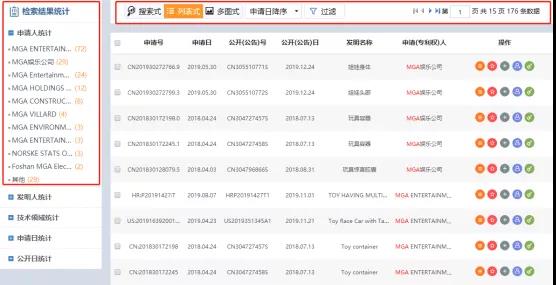 ③得到检索结果共15页/176条数据,然后在所有数据中逐一筛选排查,以选出与产品相关的专利;