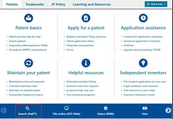 ① 打开uspto,根据需要点击左下角的PatFT或AppFT进行相关美国专利检索;