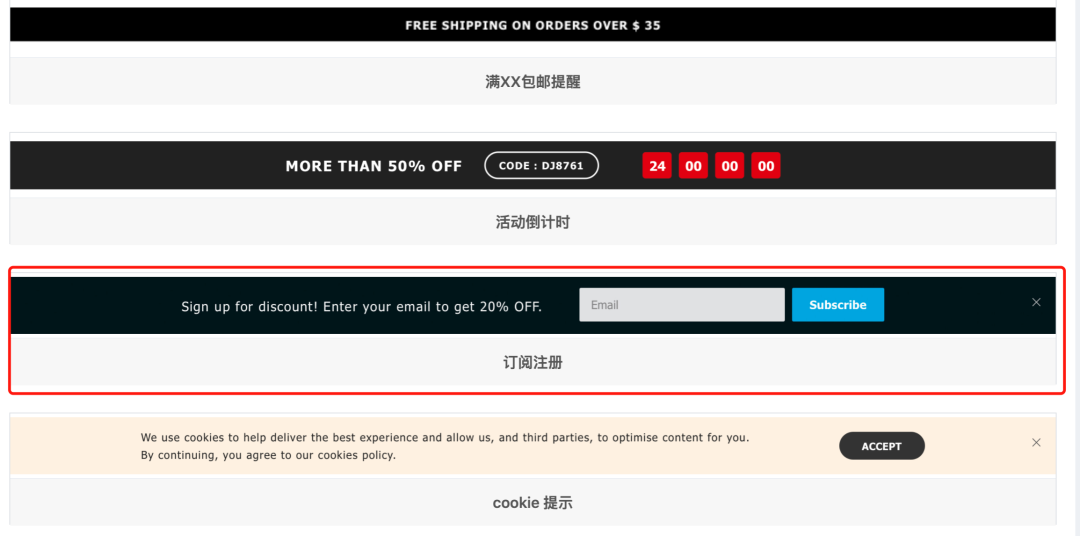 结账页面后显示“谢谢”并没有太多价值。店小匠建议可以设置成为再一次的注册邀请,设定账号密码后可获得优惠券或一些订单追踪、优先购买等会员福利。在这种方法下,新用户选择创建账户的比例通常超过75%。店小匠提示,当你为那些新注册的消费者提供优惠券时,可以限制“下次订单时可使用”或“在未不久的某一时间段内使用”,促使消费者复购。大多数卖家一想到购买注册登陆界面都会想到占据屏幕中央、显眼的弹窗样式。为了避免消费者对这类弹窗的反感,大家也可以尝试其他的弹窗样式:Shoplazza店匠 为大家提供了这些其他选择,用不同的形式达到收集消费者信息的相同目的,同时避免引起消费者反感,解决运营人员的烦恼。