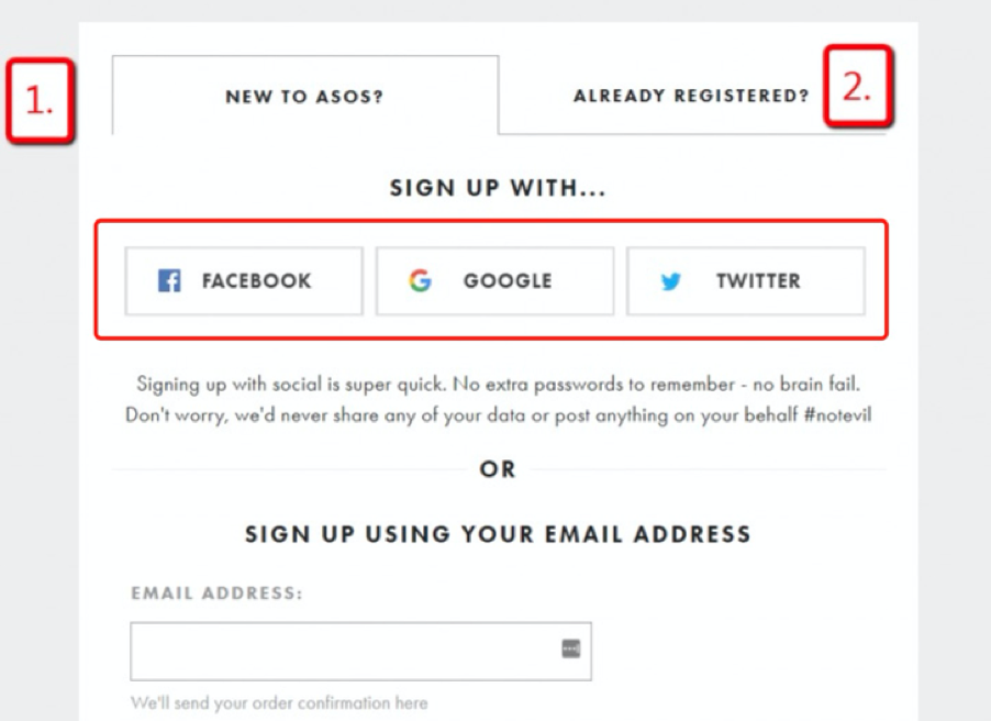 除了简单的两个选择按钮,不给消费者带来选择困难症的犹豫时间外,还给消费者社交账号登陆的选项。