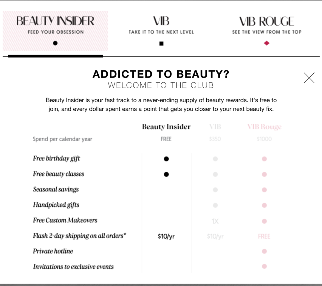 在Shoplazza店匠后台的应用市场中添加 Facebook Pixel 工具。利用 Facebook Pixel 追踪用户数据,比如当消费者浏览品牌网站或有购买行为时, Pixel 可以记录下这些消费者信息,使用自定义受众再次覆盖他们并对他们投放广告,以增加产品曝光率,促进消费者复购行为。进入 FB 广告管理工具找到受众工具, 根据客户名单、网站访客、手机APP信息创建自定义受众。其中小匠想提一下 “Website Traffic”,这是比较重要的一个部分,利用 Pixel 可以追踪到以下人群:最后我们再来分析和学习一下丝芙兰是如何建立客户忠诚度计划,提高复购率的。丝芙兰的 beauty sider 是很成功的案例之一。他们的计划主要有三层,每一层都有相对应的奖励机制。这个计划帮助丝芙兰让消费者在未来很长一段时间保持对品牌的忠诚度。一美元可以兑换一个积分,积分达到某个级别可以获得相对应的激励。当加入他们的会员计划时,将成为 Beauty Insider 级别;而当获得 350 积分( $ 350)时,将成为VIB级别; 如果一年能支出$1000,则将获得 VIB ROUGE 等级资格。此外,丝芙兰还给会员提供免费的美妆课程,还能享受免费的生日礼物和个性化推荐礼品。品牌出海卖家们可以制定一些会员激励机制,让消费者产生信任,促进重复购买行为。店小匠还有更多促进复购的策略想要分享,关注我们随后的文章。