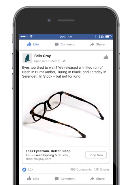 为了凸显出商品的重点和优势,商品基本都有着多个利益点,这时使用 Facebook 幻灯片广告进行推广就会非常合适。Facebook 幻灯片广告可利用多张图片向消费者展示商品利益点。图片是分享品牌故事的最佳方式,Facebook 幻灯片广告除了广告属性外,还能成为强大的视觉工具。将一系列相关图像串在一起,可以讲述你的品牌故事。每张图片代表着一个品牌阶段。得益于多图片的组成形式,Facebook 幻灯片广告还适用于展示同一商品的不同款式、一个系列的相关商品。