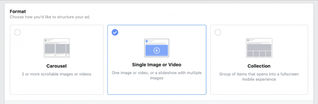 当在 Facebook 上投放广告时,幻灯片广告适用于任何目标;而在 Instagram 上,幻灯片广告可用点击量,转化,应用安装或视频观看的相应目标。2. // 选择受众群体、展示位置以及预算和时间表,在广告中选择格式是,点击「单个图像或视频」。
