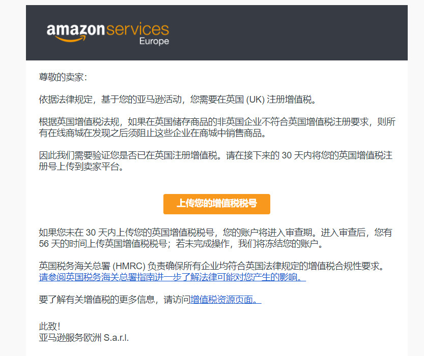 “我们已通知您,如果您没有在已通知的截止日期之前上传有效的英国增值税注册号码,您的亚马逊英国账号将会被冻结。如果您的账号被冻结,您将无法在亚马逊英国站进行任何销售活动,或通过英国FBA库存满足客户订单或创建新的货件入境到英国。