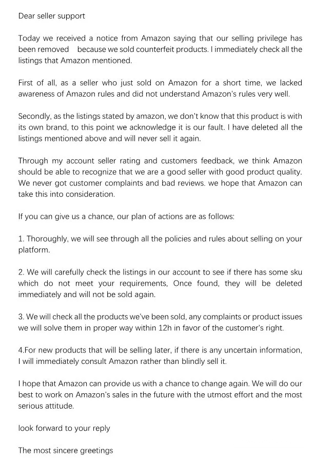 这个时候卖家要注意,申诉书是卖家与亚马逊官方进行沟通的唯一途径,所以一定不要在申诉书中加入和申诉主题无关的内容。尤其是加入一些自己个人的悲惨遭遇(比如亚马逊是自己唯一收入来源、店铺被关了就无家可归之类的表述),这种信息不仅对申诉毫无帮助,还可能起到相反的作用,毕竟美国人做事比较严谨,打感情牌往往效果并不明显,这种申诉风格的作者一般是中国的娱乐节目看的太多导致的。