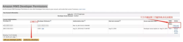 当卖家自己注册为开发者时,会收到亚马逊MWS 开发者凭证,即“Secret Key”/“Access Key”,使用亚马逊工具时会需要此凭证,同时也会收到一组开发者ID,可用来授权其他卖家。Marketplace Web Service Terms(“MWS条款”)规定,卖家不得将亚马逊MWS开发者凭证“Secret Key”/“Access Key”提供给第三方服务商。将此凭证给予第三方服务商,卖家将会无法得知与管控第三方服务商在卖家帐号里获取哪些数据、无法监测第三方服务商在什么时候、进行什么操作,更无法防范API信息会不会被复制给更多服务商。分享“Secret Key”/“Access Key”给第三方服务商的行为是违反MWS逊条款,可能会导致被封号。