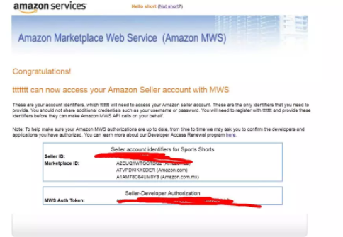 6、按照您的应用程序开发者提供的说明,为他们提供上一步骤中的 MWS 授权令牌和您的卖家ID。