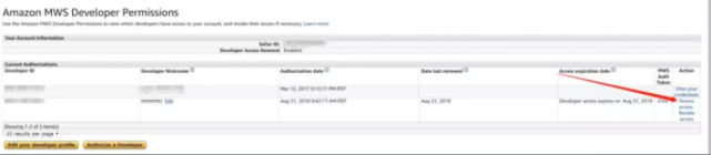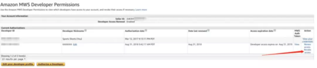 另外,B 种授权模式刚开通的时候,亚马逊会默认给予这个第三方服务商1年的开发权限,如果到期,则它们不能再访问您的任何数据,您使用它们的功能也会受到限制,当然第三方的软件让您感到非常满意,您记录一个闹钟,来提醒自己定期去给第三方软件开发商刷新使用权限,点击对应服务商的Renew access按钮: