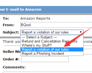 Report a violation of our rules卖家要到http://www.amazon.com/gp/help/reports/contact-us来跟亚马逊Seller Performance Team来联系!确保卖家选择Report a violation of our rules。卖家需提供 Test Buy 的 Order ID确保说其他卖家销售的商品为"假货...