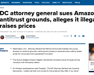5月26日消息,据外媒报道,周二,美国华盛顿特区总检察长卡尔·拉辛(Karl Racine)宣布,他已以反垄断为由起诉亚马逊,指控该公司的做法不公平地抬高消费者的价格,并且压制了创新。诉讼称,亚马逊通过使用合同条款,阻止其平台上的第三方卖家在其余平台以更...