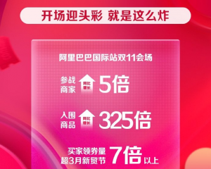 11月11日消息,小编获悉,阿里巴巴国际站官微今日宣布,阿里巴巴国际站双11正式开启,开场迎头彩,显跨境贸易实力。阿里巴巴国际站双十一会场参展商家同比增长5倍,入围商品同比增长325倍,买家领券量超3月新贸节7倍以上。据小编了解,作为阿里旗下跨境B2B平...