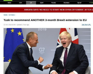 英国议会原则上通过首相约翰逊的脱欧协议,可随后就否决了协议的立法时间表,据今日俄罗斯(RT)10月22日报道,欧洲理事会主席图斯克当天表示,他建议将英国脱欧期限再延长90天,避免出现无协议脱欧的情况。RT称,当地时间22日,图斯克表示,英国脱欧的...