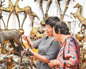 9月23日,在广西南宁举行的第十六届中国—东盟博览会上,一带一路相关国家的参展商带来的商品吸引众多参观者前来选购。图为参观者在南宁国际会展中心选购巴基斯坦青铜器。10月14日,新加坡《联合早报》网站引用中国海关总署的数据显示,今年前三季度,我...