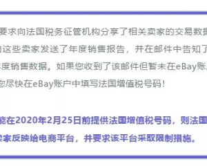 eBay官方公众号发布文章,催促卖家在2月25号前上传法国增值税税号。在文中,明确表示若卖家未能在2月25日前提供法国增值税号码,法国税务机关有可能把增值税不合规的卖家反映给电商平台,并要求该平台采取限制措施。此外,亚马逊也于24日发布了相关内容。其实...