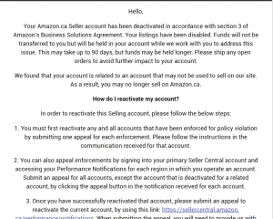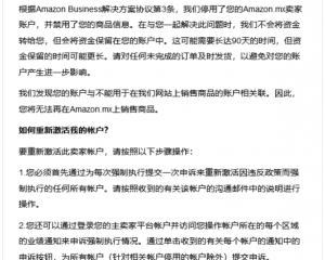 近日,有卖家反馈,最近加拿大站和墨西哥站忽然收到您的销售权限已被删除的邮件。然而,卖家反馈,加拿大站和墨西哥站都没有卖过东西,不知道为啥会收到这个邮件,也不知是否会波及美国。邮件内容显示,卖家账户与不能用于在网站上销售商品的账户相关联,...