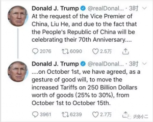 " 中秋国庆好日子。" 12日早,特朗普宣布推迟加征中国商品关税 12日早,美国总统特朗普在社交平台上表示,美国将推迟对价值2500亿美元的中国商品加征关税。 他称,作为善意的表示,将加征2500亿美元商品关税的决定推迟到10月15日。原先这批商品的关...