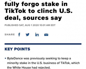 外媒消息称,在美国总统特朗普表示他已决定禁用TikTok不久后,TikTok母公司字节跳动日前已同意完全剥离TikTok在美国的业务,以试图挽救与白宫的一笔交易。此前,TikTok被美国多个政府部门指控,称其涉嫌威胁美国国家安全,试图通过行政手段阻止其在美国的运营...