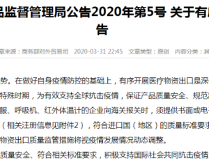 3月31号晚上22:45,商务部、海关总署、国家药品监督管理局发布了关于有序开展医疗物资出口的公告。在公告中明确了,自4月1日起,出口新型冠状病毒测试剂、医用口罩、医用防护服、呼吸机、红外体温计等医疗物资时,需要提供书面或者电子声明,承诺出口产品有...
