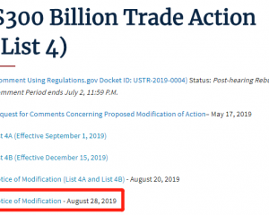 刚刚,美国当地时间2019年8月28日,美国贸易代表办公室官网发布通知,确认针对中国输美3000亿美元产品(LIst 4清单)关税税率由原定的10%提高至15%,按两个批次执行,对3000亿美元加征关税产品分为A、B两个清单,List 4A清单中的产品将于美国东部时间9月1...