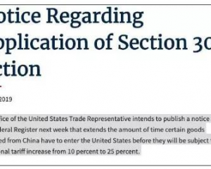 美国对部分中国进口商品推迟加征关税时间6月1日,美国贸易代表办公室(USTR)消息,USTR将会在下周联邦公报上发布一份通知,延长自中国出口的某些商品进入美国的时间至6月15日,随后,这些商品的关税才会从10%提高到25%。根据该公告,2019年5月10日前从中国出...